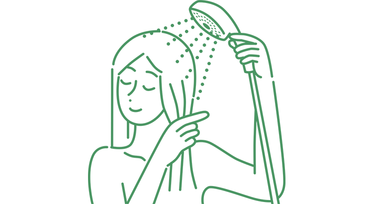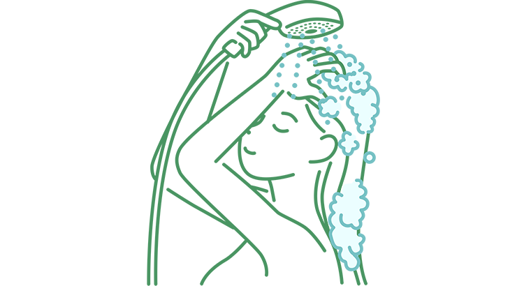 まずは38℃のぬるま湯で髪と頭皮を十分にぬらす「予洗い」をしましょう。これは髪を傷めず、頭皮をまんべんなく洗うための重要なポイントです。